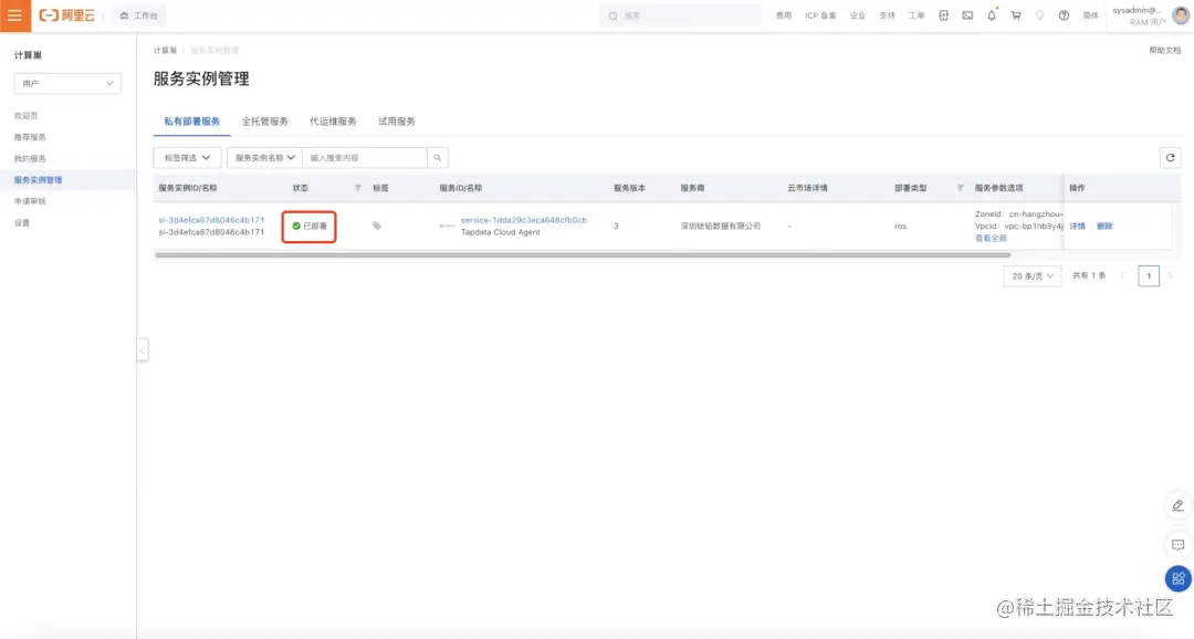 可在服务实例管理界面查看部署状态及代运维服务等信息。