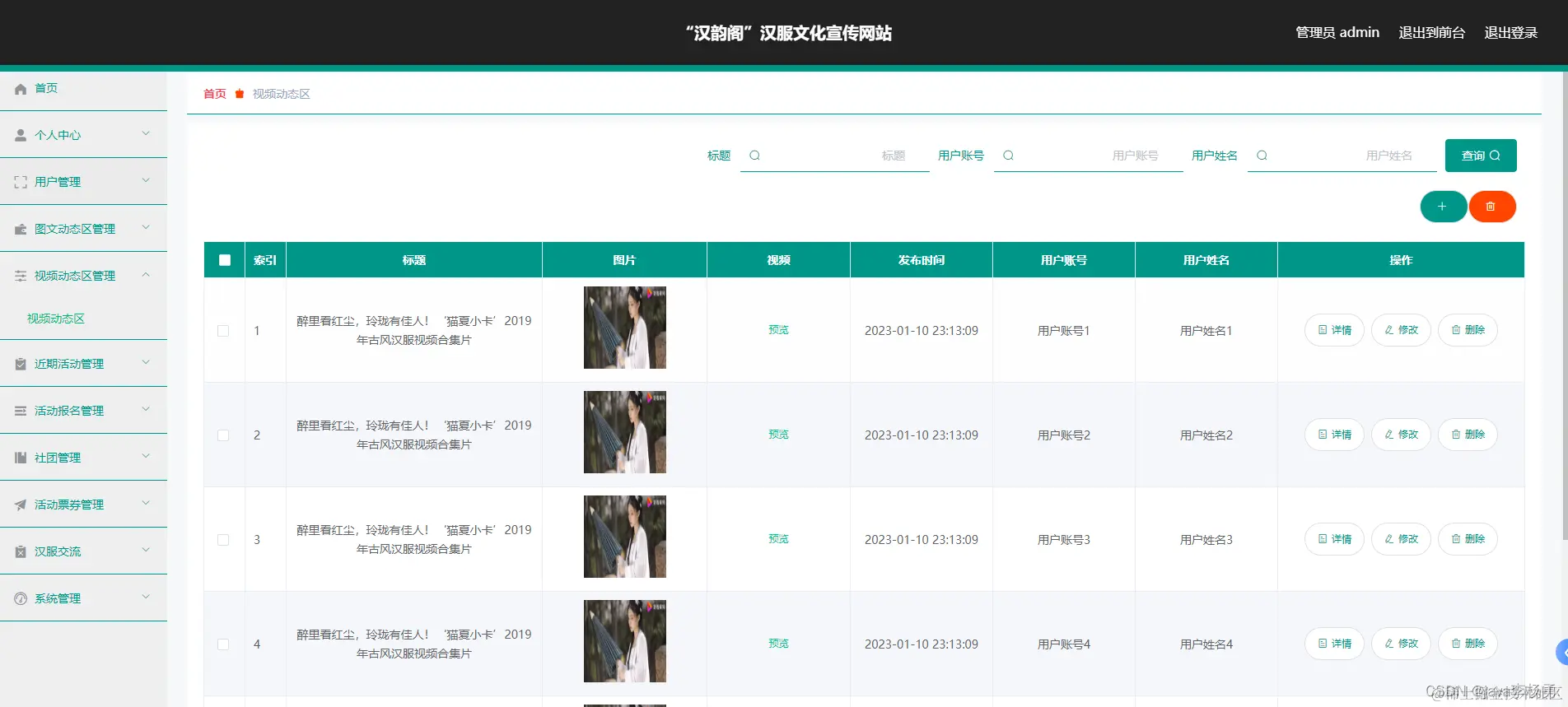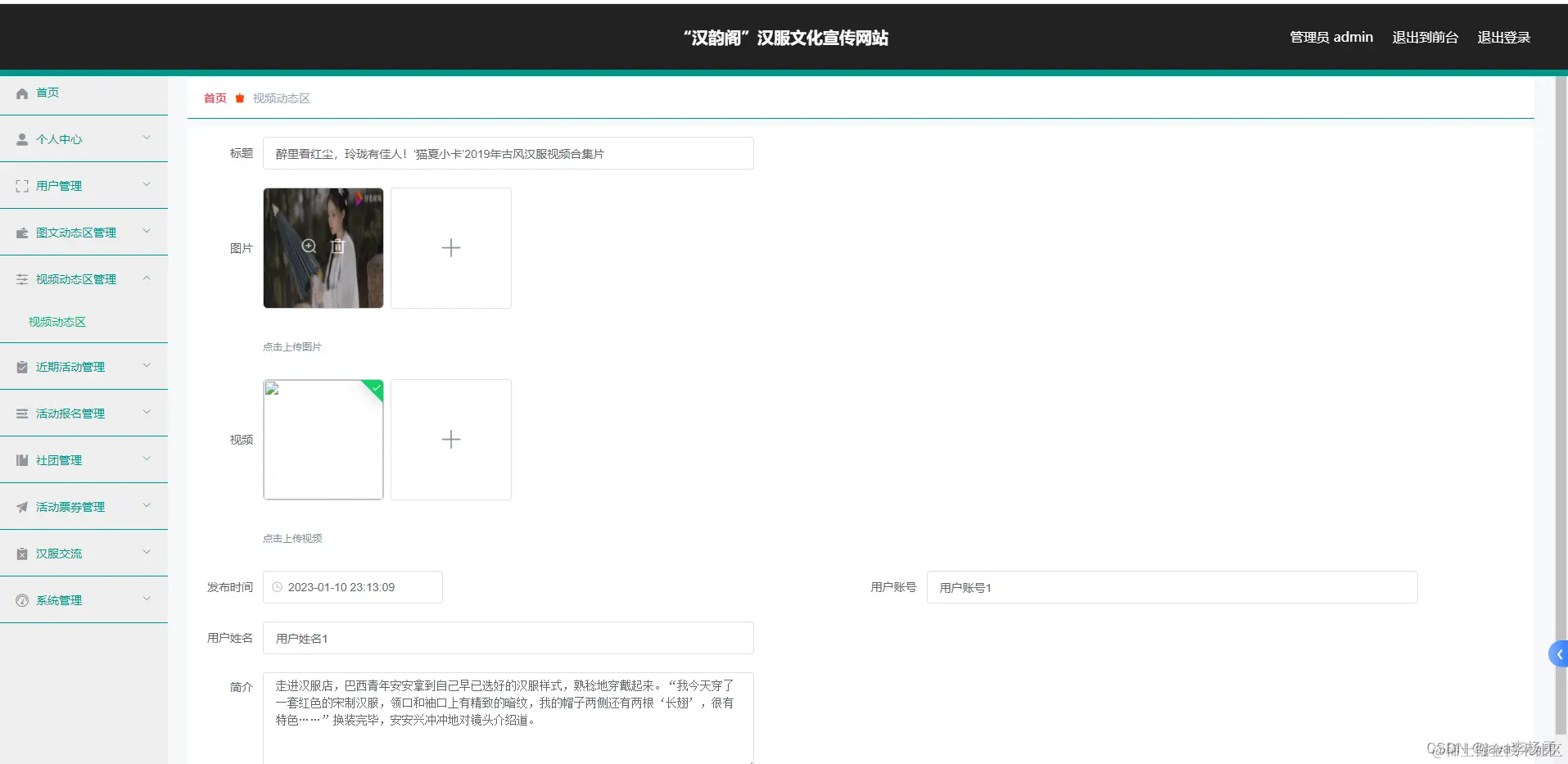 后台可以上传图片以及视频等,这里可以查看详情以及播放视频。