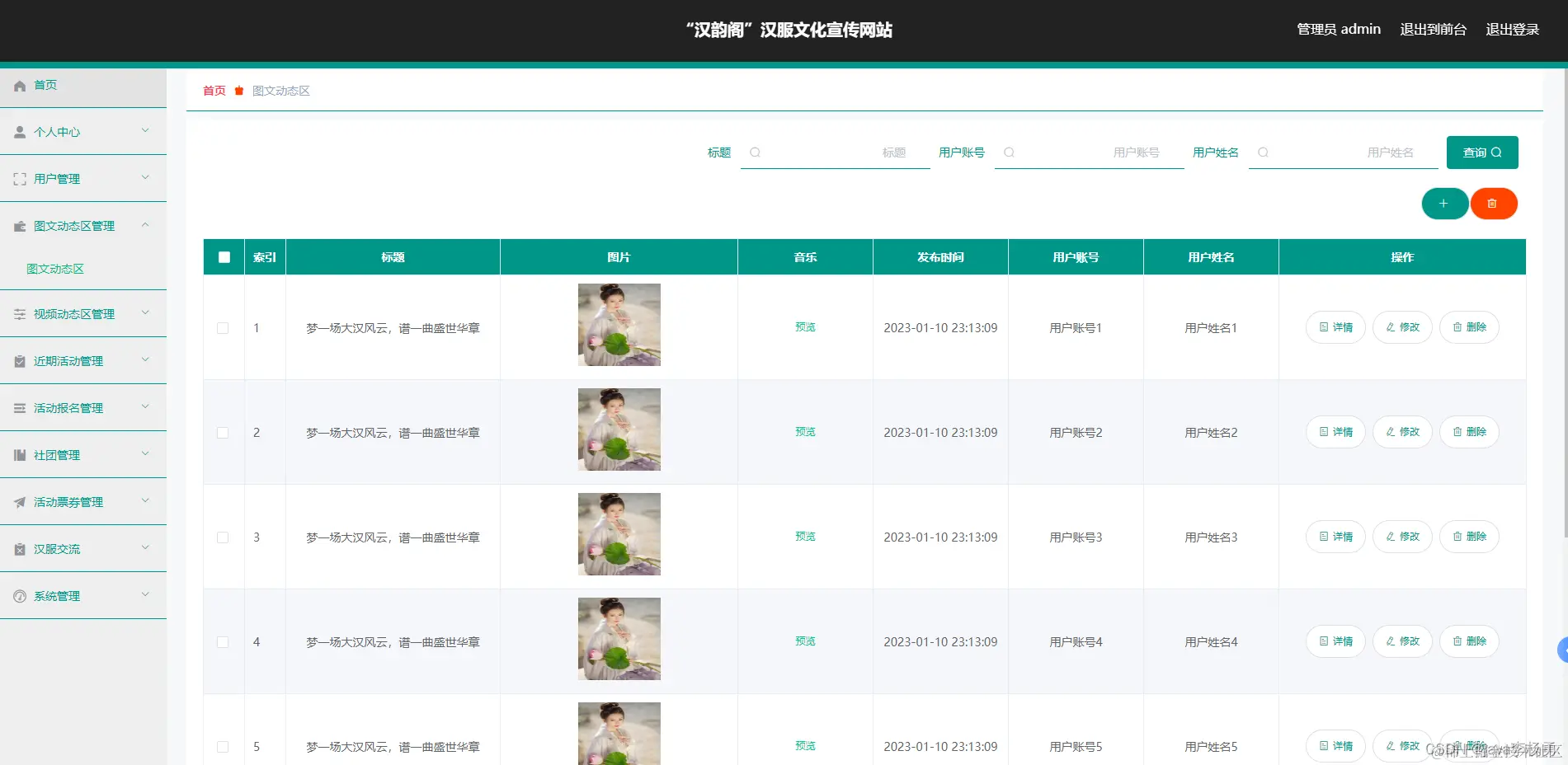 国风汉服文化交流宣传系统的整体功能模块的实现,主要是对自己在大学这几年时间所学内容的一个测试,对于系统,主要是通过现在智能化的国风汉服文化交流宣传系统开始系统的实现,并且可以根据需求进行数据信息的增加修改删除等操作,完美的解决了当下国风汉服文化交流宣传系统中所遇到的问题。经过一个学期的毕业设计的实现完成已接近尾声,到目前为止,当我回想起整个学期的系统开发日,收获颇丰。毕业设计的主要任务是建立一个智能化的国风汉服文化交流宣传系统的信息系统,主要使用SpringBoot框架和Mysql数据库的开发工具,对系统的每个功能模块进行相对应的操作,最后,系统调试结果表明系统基本可以满足功能要求。国风汉服文化交流宣传系统的开发对我大学学习的改进有很大帮助。它使我能够学习计算机知识的相关技术方面问题及与人交往的沟通交流方面,让我意识到无论我们做什么,我们都需要坚持不懈,努力工作,只有这样尝试了并且坚持去做了,我们才可以成功,才可以获得成功的喜悦,如果没有尝试,只是想,那连成功的机会都没有,实际操作进行做了,才会越来越近的靠近成功,随着道路一路向前,未来的路是美好的。对于国风汉服文化交流宣传系统的实现,是自己第一次完成的设计一个管理系统。在项目的设计过程中,我克服了各种困难,并且在面对这些困难,我积极的面对,想办法解决问题,并且更好的掌握了理论知识和动手操作实践能力,从系统的开发到设计完成,我完成了一个更全面、更完善、更安全的平台管理系统,这也让我取得了很大的成就感,也使我对未来的生活更有信心。