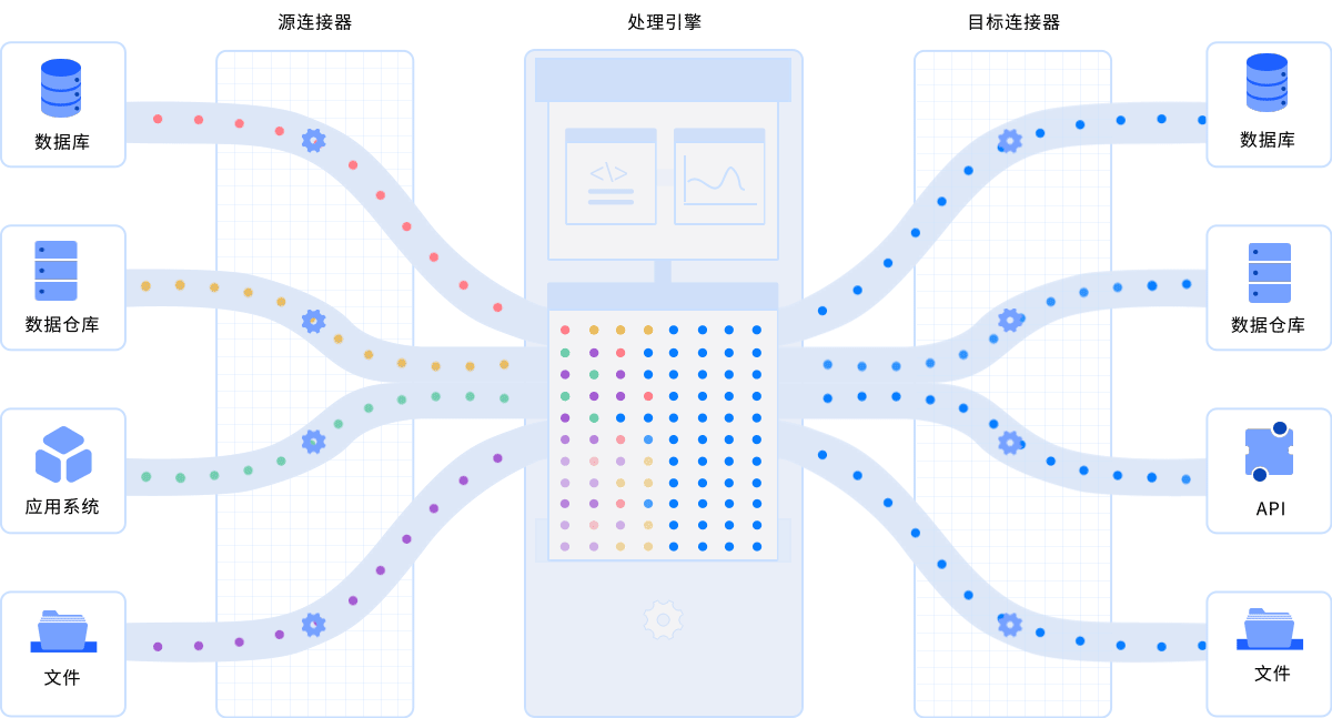 以实时的方式从各个数据来源,包括数据库、API、队列、物联网等数据提供者采集或同步最新的数据变化。支持多源异构数据双向同步,自动映射关系型到非关系型。一键实现实时捕获,毫秒内更新。已内置50+连接器且不断拓展中,覆盖大部分主流的数据库和类型,并支持您自定义数据源。