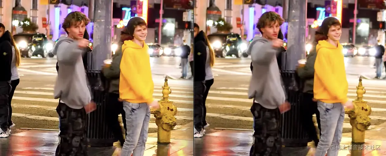 最后的执行效果,左图为滤镜后的视频,右图为原视频: