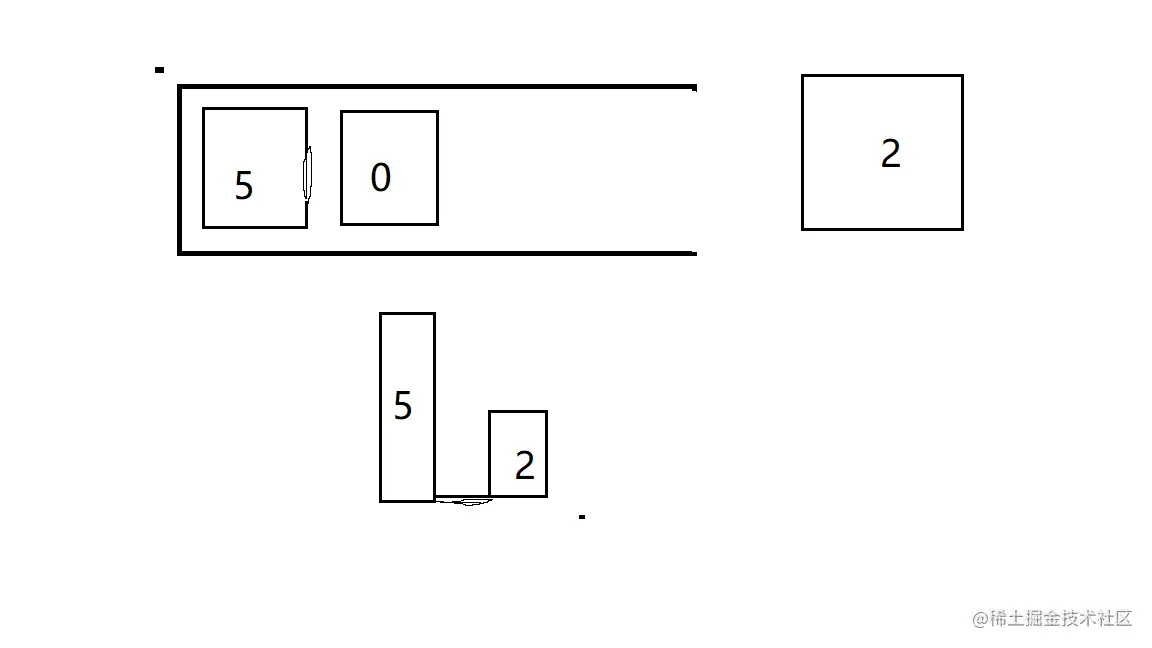 当计算完上面两小块后,栈内还剩元素5、2(同样为了方便表示),再继续计算4左边的剩余青豆数,计算完成后,左半边计算完毕
