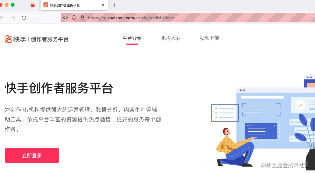 最后,不要忘了手动打开一次 cp.kuaishou.com/article/pub…,通过手机扫码或输入用户名密码,成功登录一次快手平台,生成profile,以后只要登录信息不过期,selenium每次新建网页session时,都能直接进入上传页面而不需要再进行登录了。