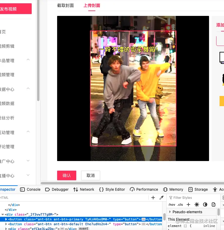 视频上传成功后,我们就可以开始上传在上一篇文章中制作好的封面图片了。首先找到“编辑封面”的HTML元素, <button class="ant-btn ant-btn-primary"...>