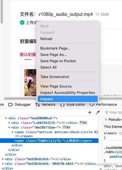 那么如何用代码判断上传成功呢?同样的我们找到这个“上传成功”文字的HTML标记,得到它是span类型的类名为"DqNkLCyIyfQ-"。