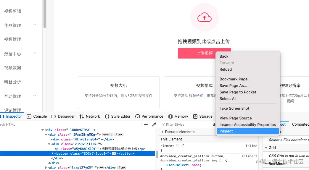Selenium提供了一个很实用的WebDriverWait(driver, timeout).until()方法,可以在给定的时间里等待元素可用,一旦可用就立即返回元素对象。对于上面的“上传视频”按钮,直接看代码,我们用到了CSS_SELECTOR来定位button类型元素的class名称: