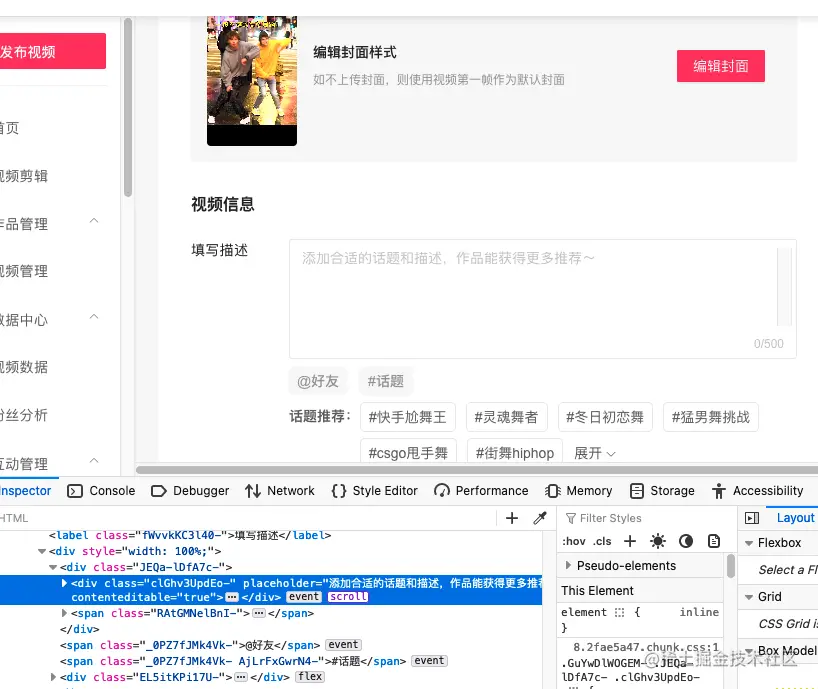 上传完了视频和封面图片,最后一个需要输入的就是视频描述了,这个就很简单了。找到输入框的HTML元素标记 <div class="clGhv3UpdEo-"...>: