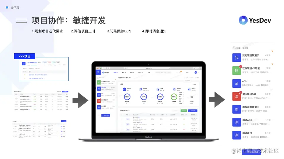 而YesDev在项目协作方面,最大的特色和亮点就是让你和你的团队,可以按熟悉的使用方式,以类似聊天的简单方式,进行项目的协作。YesDev会提供简单、易用、前端友好的交互设计,为每个成员提供贴心友好的项目协作列表、个人待办事项的红点提示、实时最新项目动态的消息通知、多合一的项目协作。