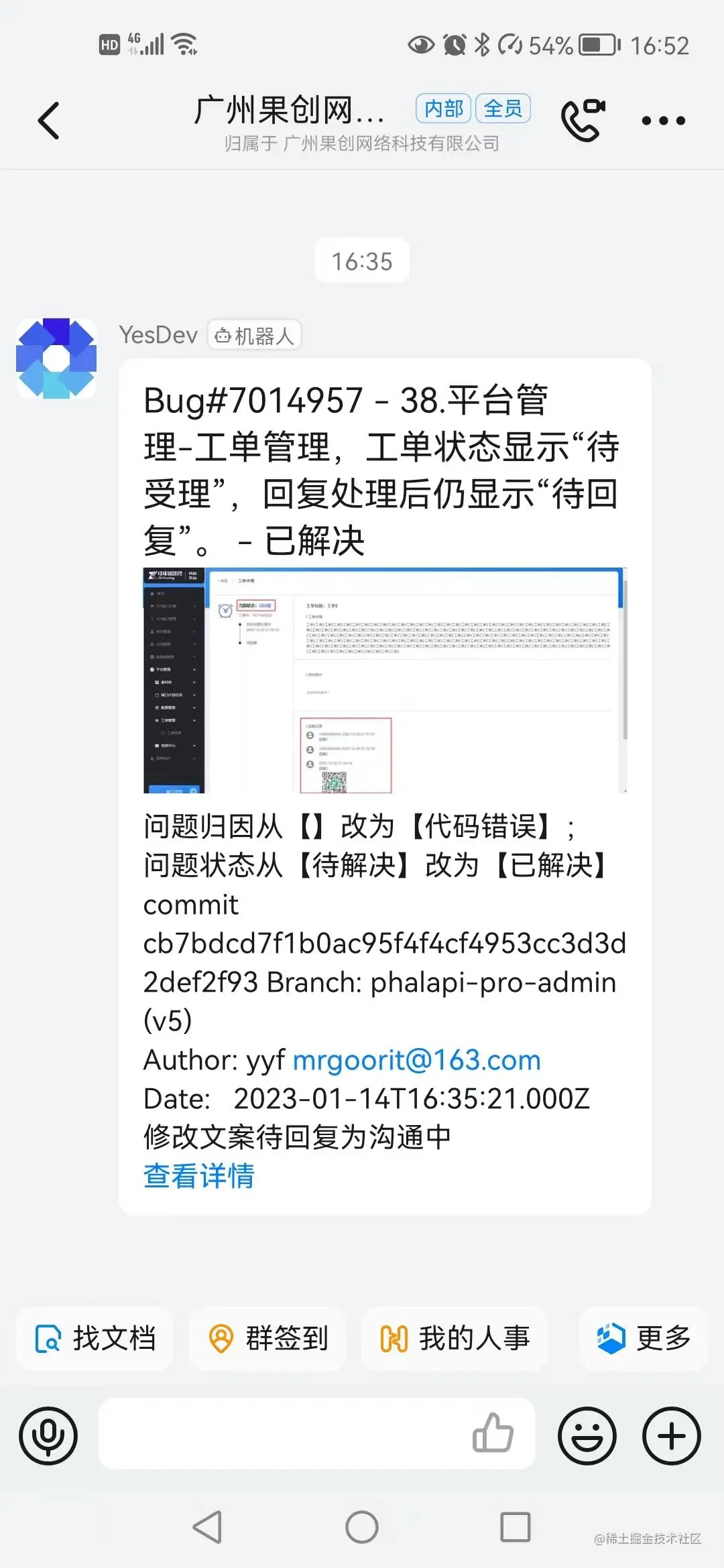 再来看下同时集成了钉钉群机器人、Git Webhook和智能流转的通知效果,可以让开发人员切实提升研发协同和实时沟通反馈的效率。