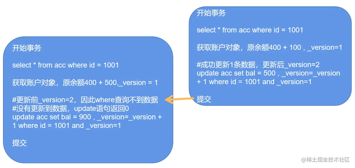 如果执行过程中出现并发问题,在执行过程中因为其他线程已将版本变化,原线程更新时找到对应版本,因此无法更新数据