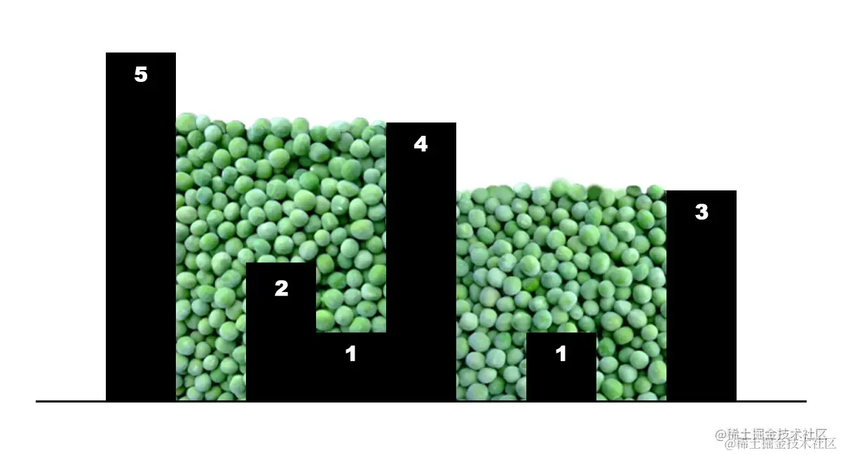现有 n 个宽度为 1 的柱子,给出 n 个非负整数依次表示柱子的高度,排列后如下图所示,此时均匀从上空向下撒青豆,计算按此排列的柱子能接住多少青豆。(不考虑边角堆积)