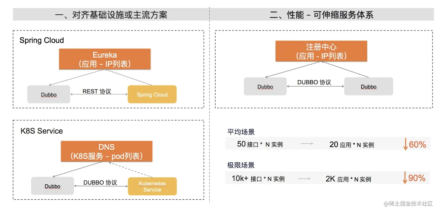 - 提升性能与可伸缩性。支持超大规模集群的服务治理一直以来都是 Dubbo 的优势,通过引入应用级服务发现模型,从本质上解决了注册中心地址数据的存储与推送压力,相应的 Consumer 侧的地址计算压力也成数量级下降;集群规模也开始变得可预测、可评估(与 RPC 接口数量无关,只与实例部署规模相关)。