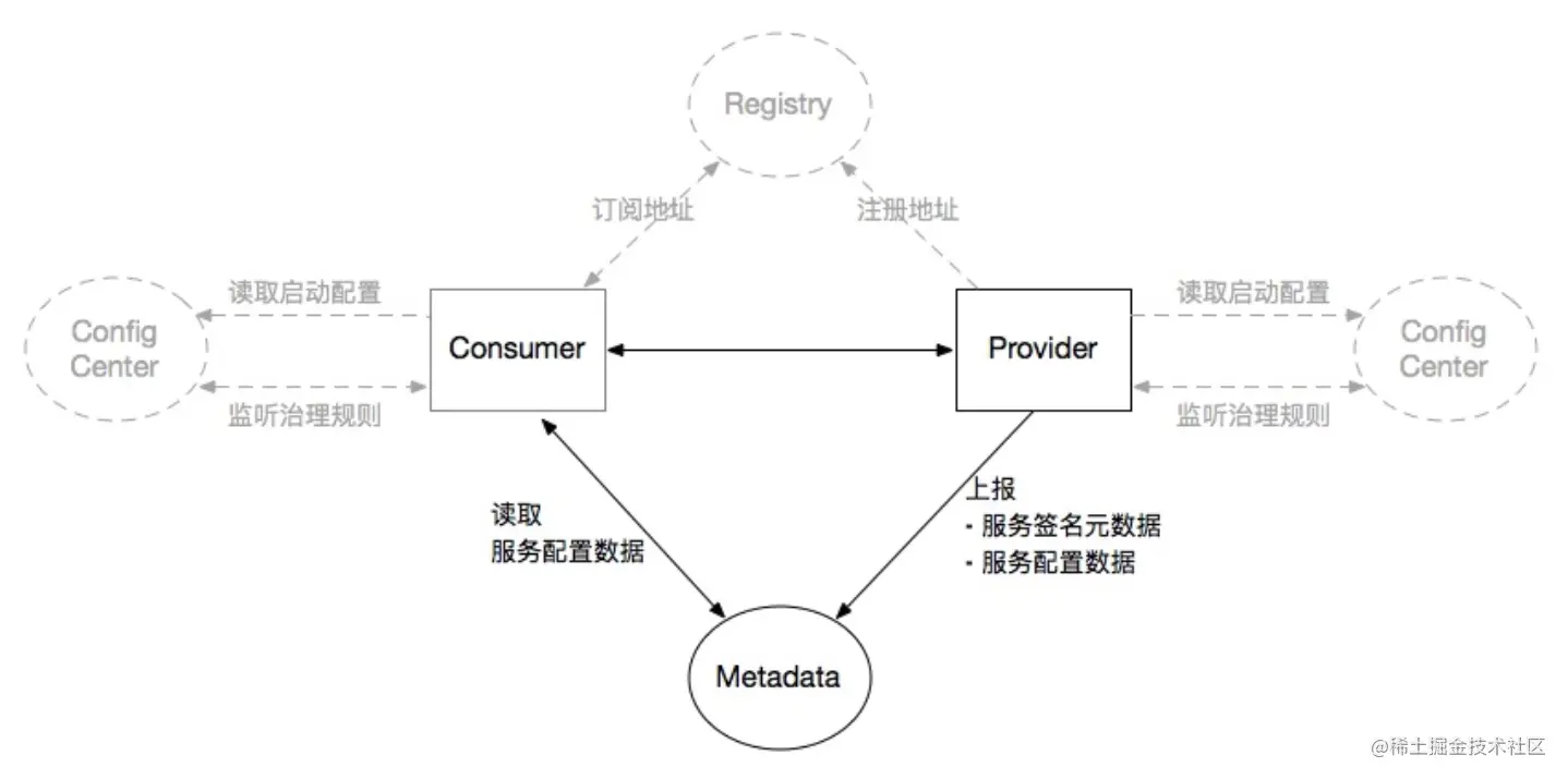 该图中不配备元数据中心,意味着Consumer可以从Provider暴露的MetadataService获取服务元数据,从而实现RPC调用。