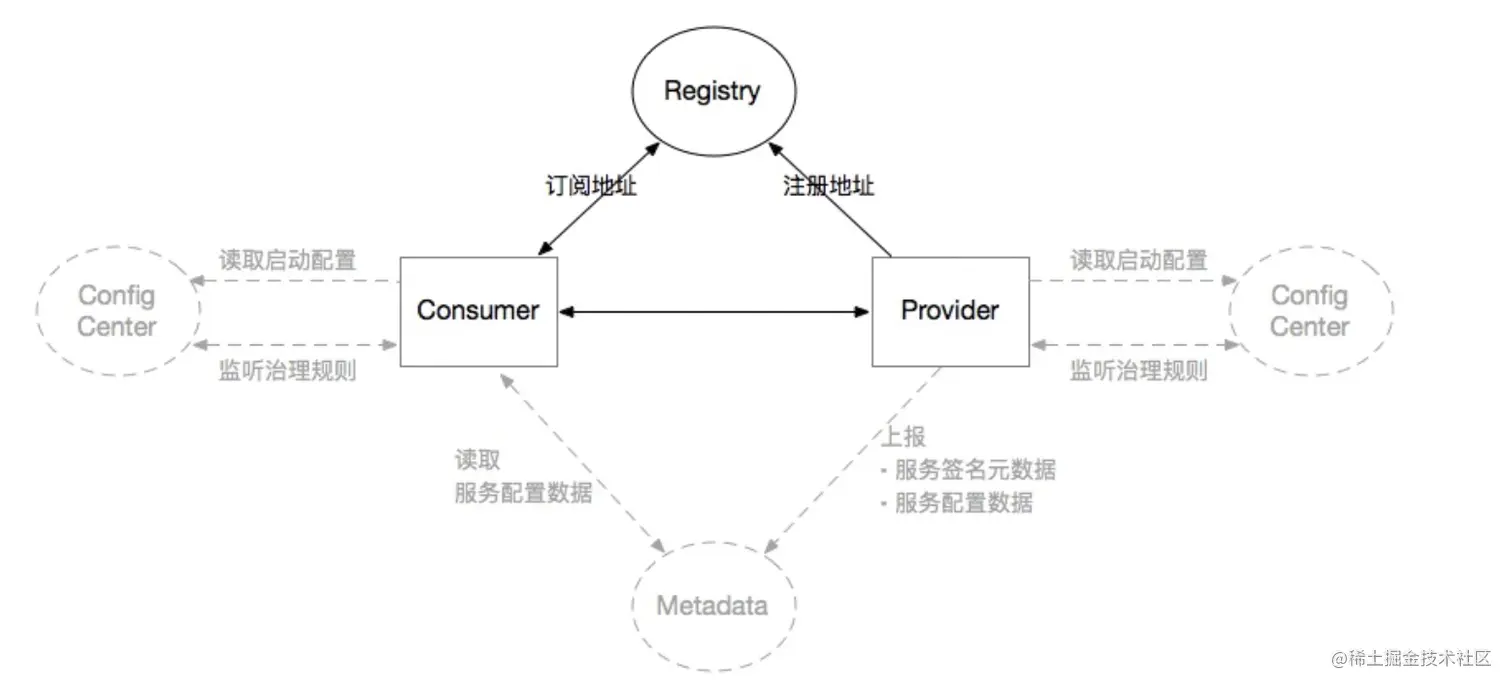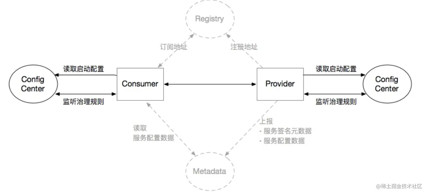 从上面的图中,我们可以看出来,整体的的Dubbo的Rpc框架中,除了对应的Consumer消费端、Provider服务提供端,Registry注册中心这些之前dubbo中已经定义的中心化组件之外,还多出了config-center、metadata这两个中心。