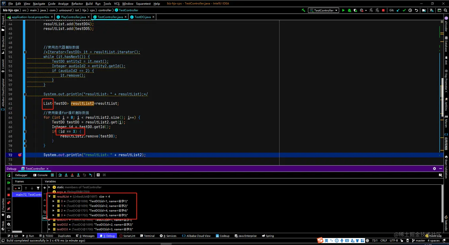 使用增强for循环遍历,增删操作使用迭代器实现。原因我们后面说,没空看的直接看到测试代码就可以了,先把工作解决了。