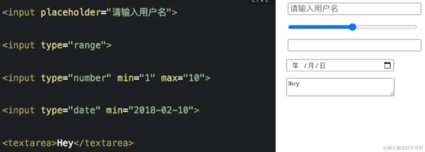 - date:输入日期,带有calender控件,还能设置min