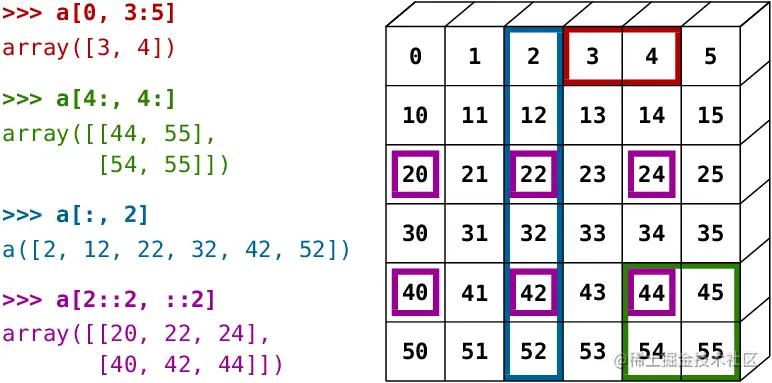 - 红色切片取第0行的,第3-第4个元素(左闭右开)