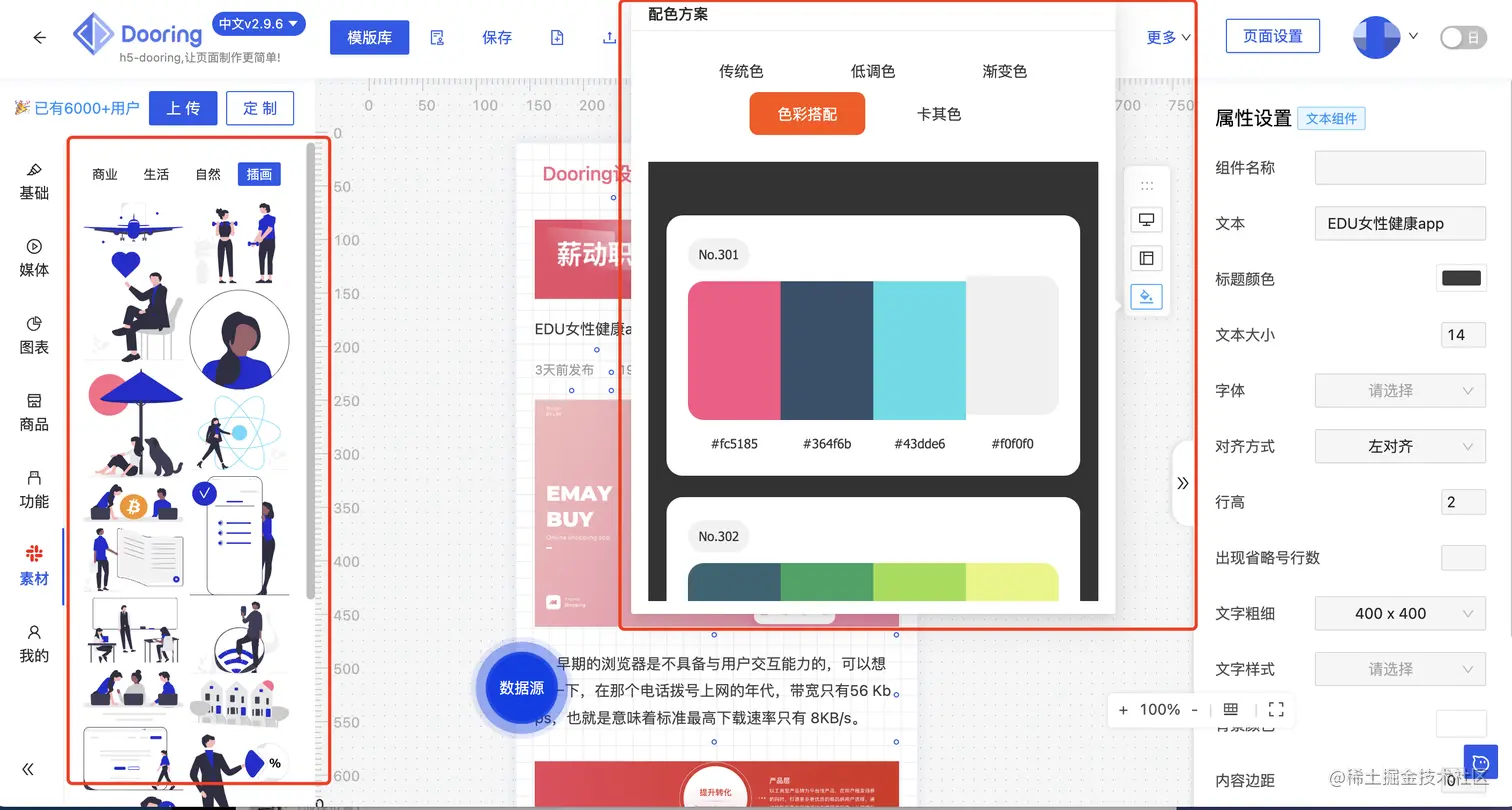 在传统搭建平台里, 如果没有丰富的模版支持撑, 小白用户很难做出精致的页面, 包括设计元素, 包括色彩搭配等, 所以基于这样的背景, Dooring 引入了免费素材库和色彩搭配面板, 方便用户做页面设计参考: