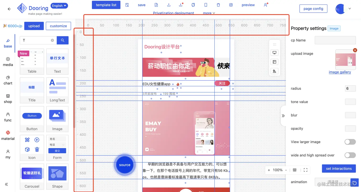 画布辅助设计主要是为了帮助用户更精准的进行页面搭建, 使得非技术人员也能做出专业的页面设计. 接下来分享一下 Dooring 在画布辅助上做的改进.
