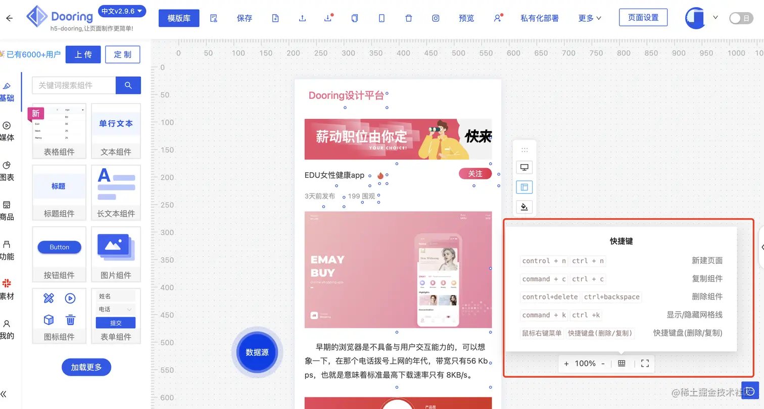为了方便用户在画布中高效的创作, 快捷键是必不可少的, 所以 Dooring 也提供了快捷键的能力: