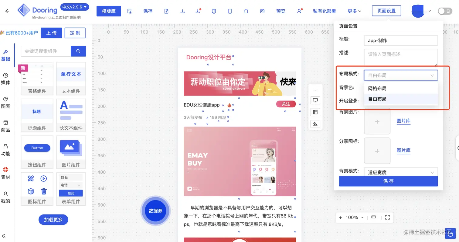传统搭建平台一般都是自由布局或者自然流布局, 搭建模式比较单一, 很难满足用户不同业务场景的搭建需求, 所以Dooring 在这方面做了一定的创新, 同时支持两种模式的搭建:
