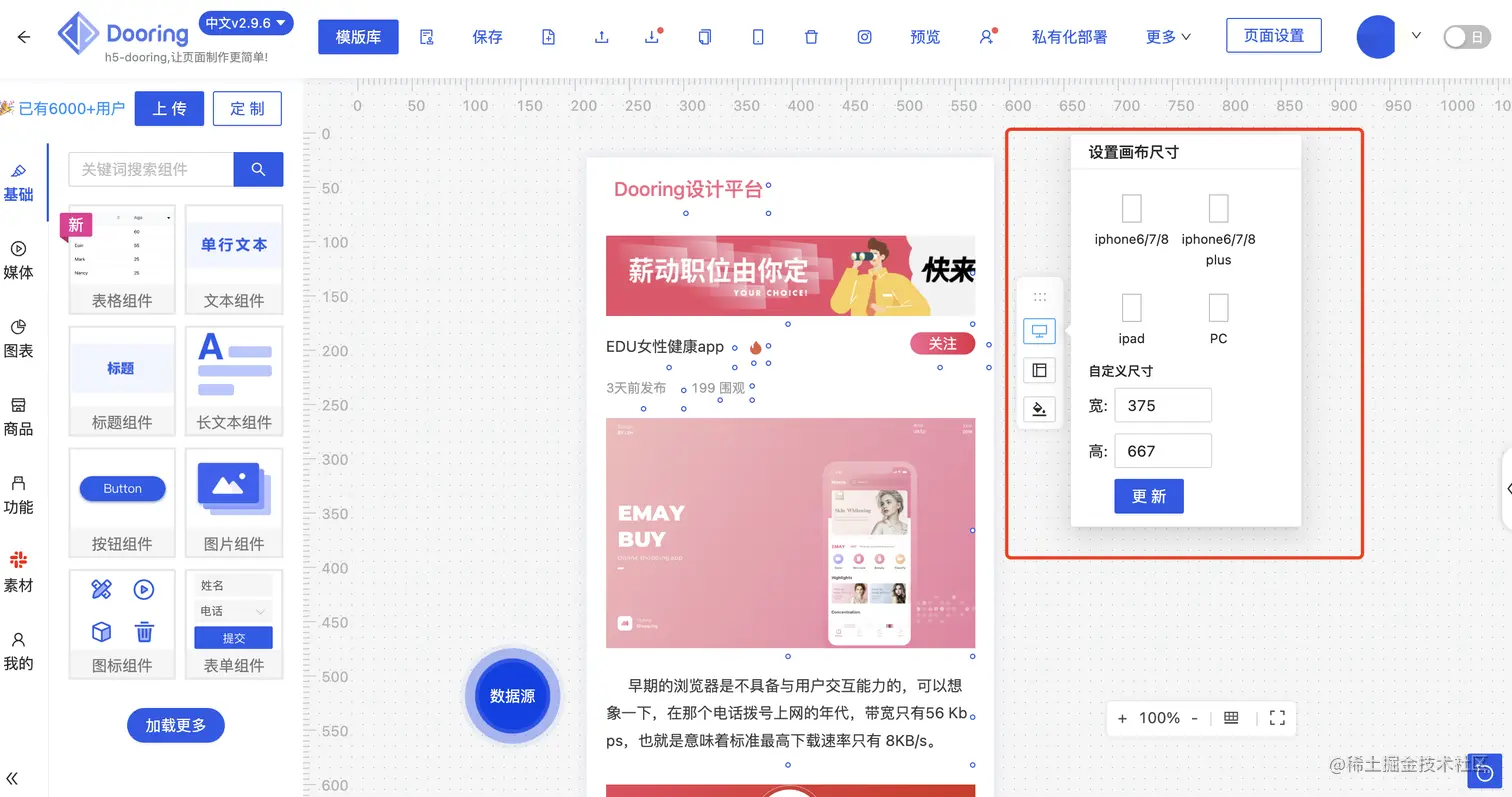 通过 Dooring 提供的画布控制面板, 我们可以快捷的切换画布大小, 或者通过手动输入自定义尺寸的方式来改变画布大小.
