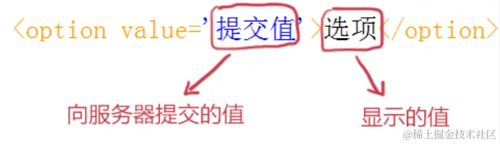 2、select标签里面只能放option标签,表示下拉列表的选项。
