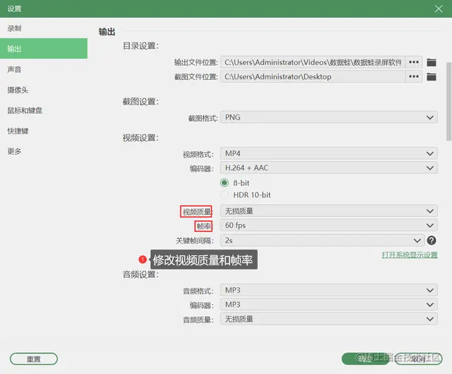 备注:如何录制流畅清晰的视频?点击【视频录制】页面右上角的【输出设置】按钮,在【设置】页面,您可以调高视频的帧率,把输出质量改为无损质量,这样您就可以录制流畅的视频。