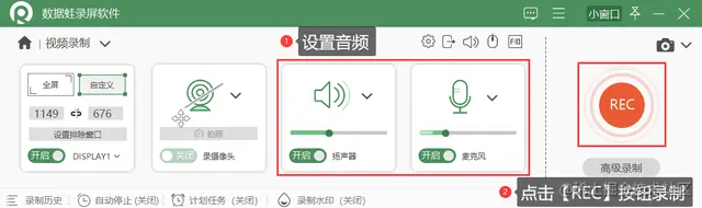 **步骤3.**点击软件主界面【视频录制】,进入【视频录制】页面,如果您需要录制内部声音可以开启扬声器;如果您需要录制外部声音可以开启麦克风。接着选择录制的范围,然后点击【REC】按钮进行录制。