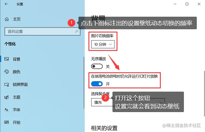 步骤4: 在【图片切换频率】里面,选择你要调整壁纸切换的频率。然后打开【使用电池供电时仍允许运行幻灯片放映】。设置完成,就可以在电脑的桌面看到你设置的动态壁纸了。