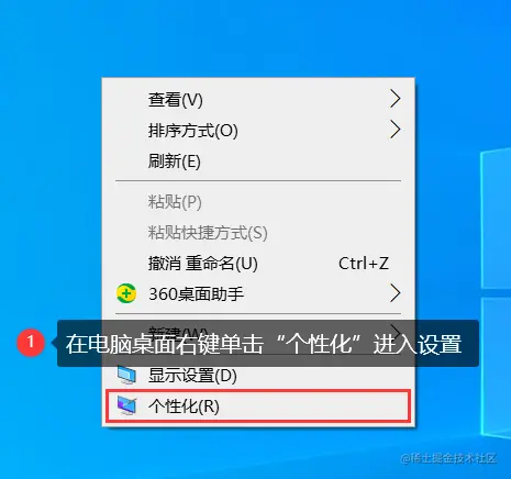 步骤1: 鼠标在电脑桌面的任一空白处右键点击,选择【个性化】;
