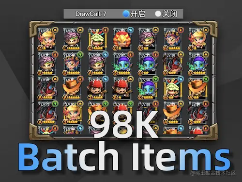 如果因游戏中因节点太多导致图文分层原因,打断合批造成 DrawCall 剧增影响性能和增加发热问题,98K合批可以说是首选的优化工具。