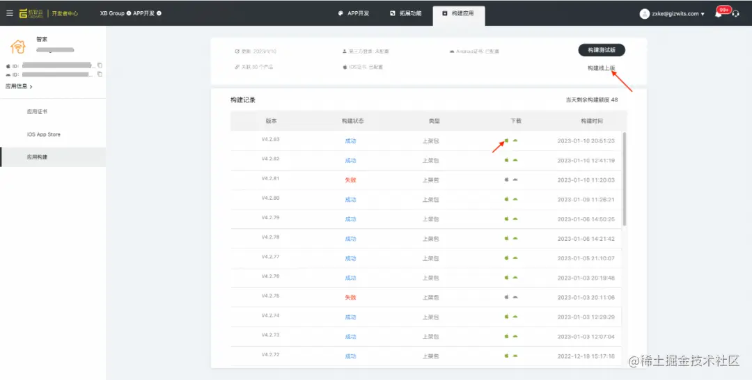 第四步:返回机智云开发者中心平台,应用构建中【构建线上版】。
