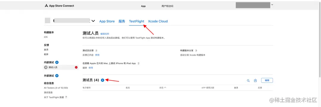 第五步:构建成功后,就能在App Store Connect后台的TestFlight中看到构建的iOS APP,在内部测试或外部测试中添加测试者的Apple账号。