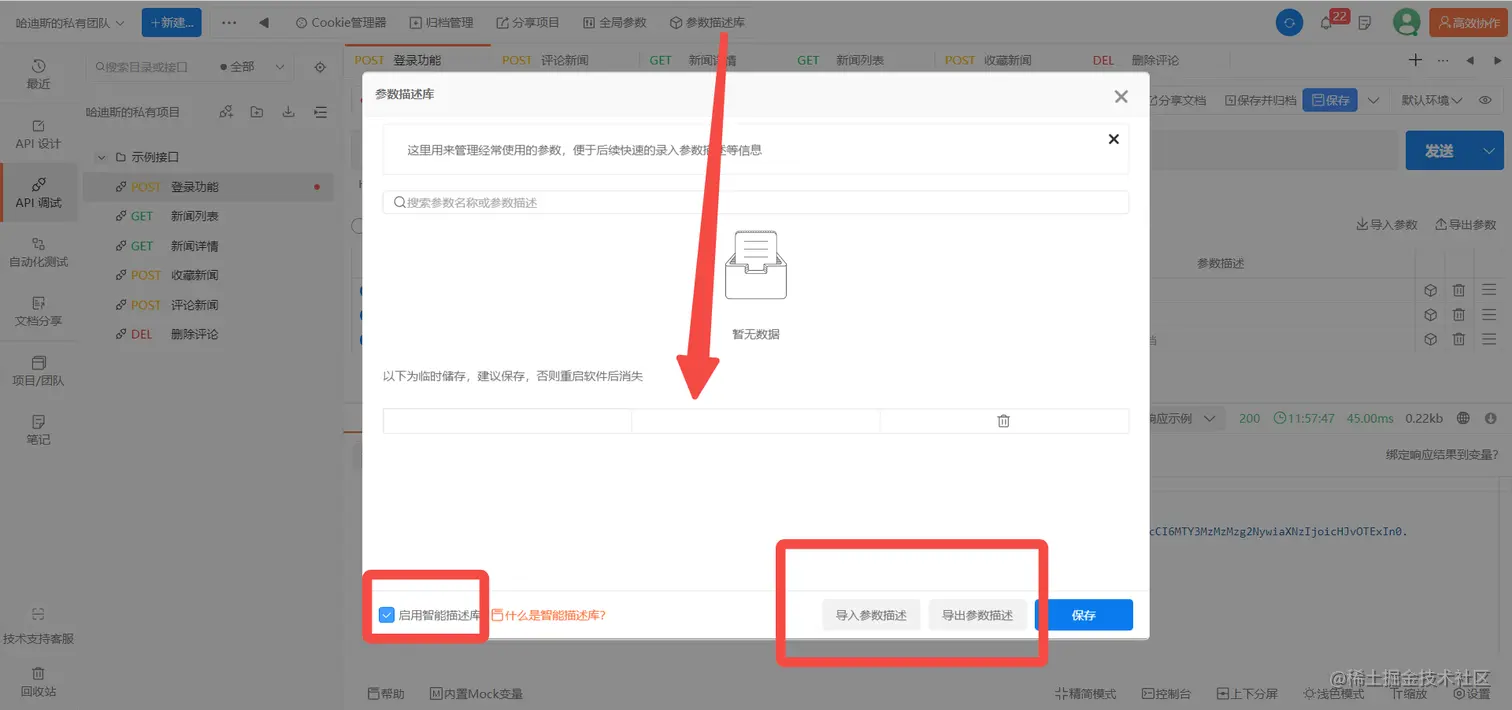 ApiPost 还可以自定义参数描述库,将项目用到的大量参数进行预注释,下次调用直接点选。如果你没有自定义描述库,第一次输入描述后也会自动加入描述库。