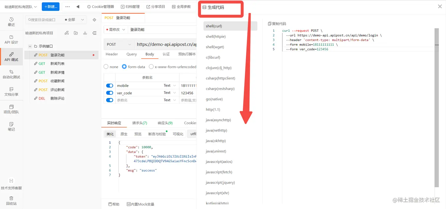 提供多达多种语言以及各种 SDK 的 HTTP 请求代码,代码可以非常快速的集成到您的代码中。