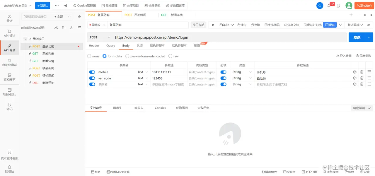 文档信息丰富学习成本低,功能齐全,用户在社区的提问反馈及时!在现在这样的敏捷开发年代,API 研发越来越注重整个项目的协作,比如 API 调试、API 文档,如果能贯穿整个研发流程,与项目所有角色打通,团队效率和效果都将大大提高!Apipost 就解决了这个问题。