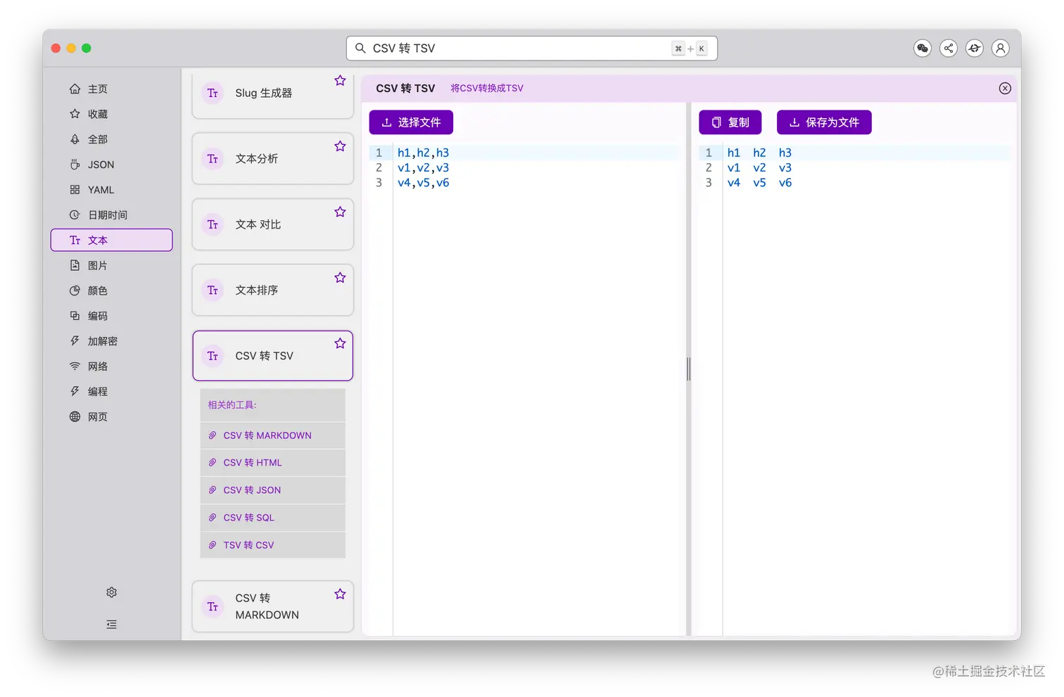 CSV 类转换工具,目前支持 CSV 与 Markdown、HTML、JSON、SQL 的互转