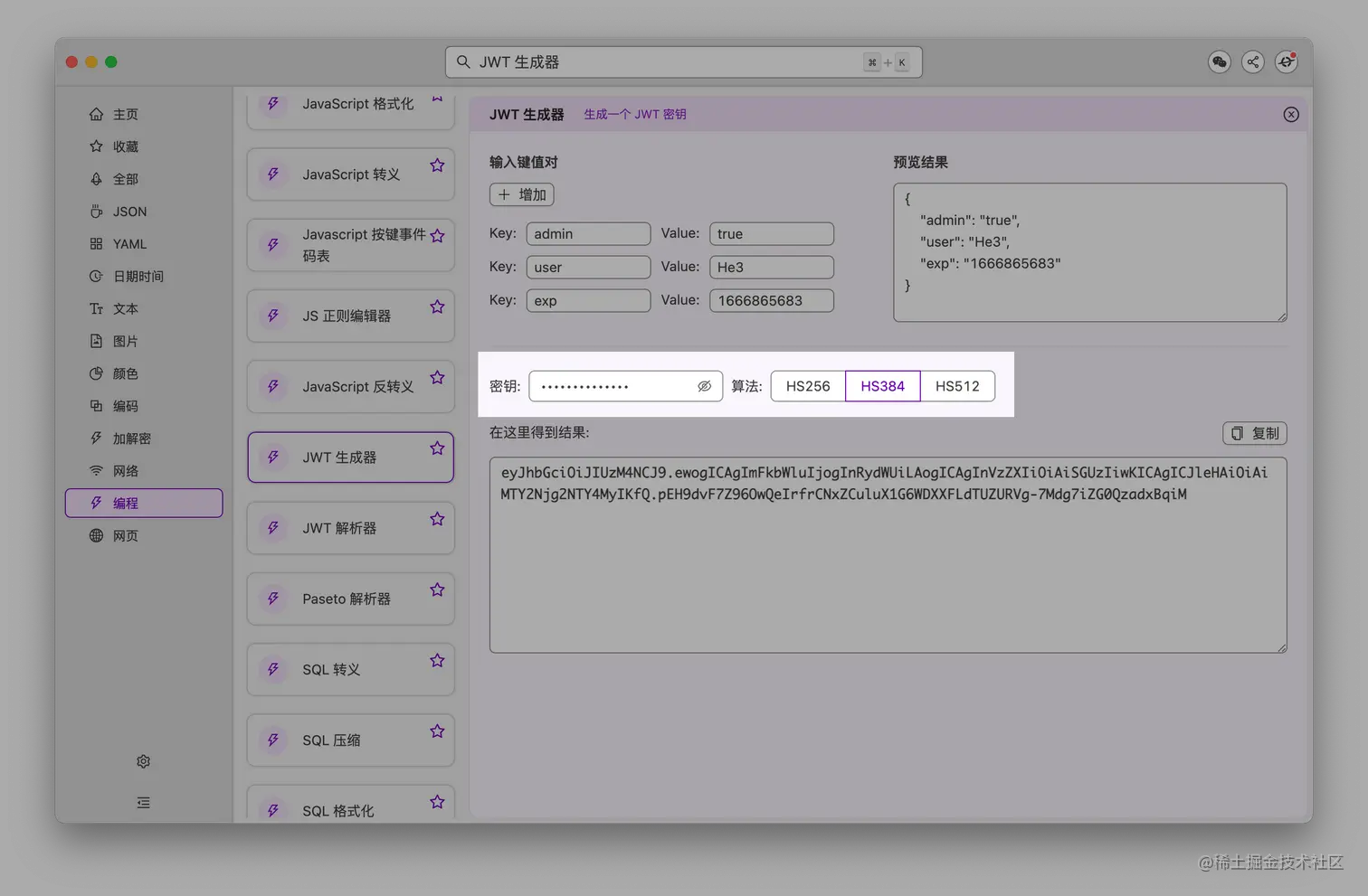 「JWT 生成器」 支持更多的加密算法,包括非对称加密算法