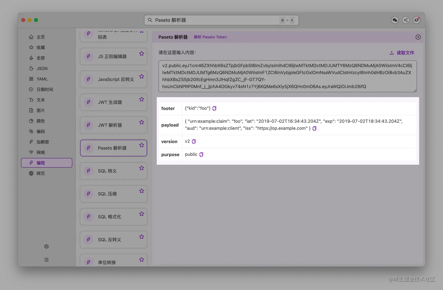 - 「Paseto 解析器」升级,支持指定 SigningKey,并支持 JSON 和 List 不同展示结果