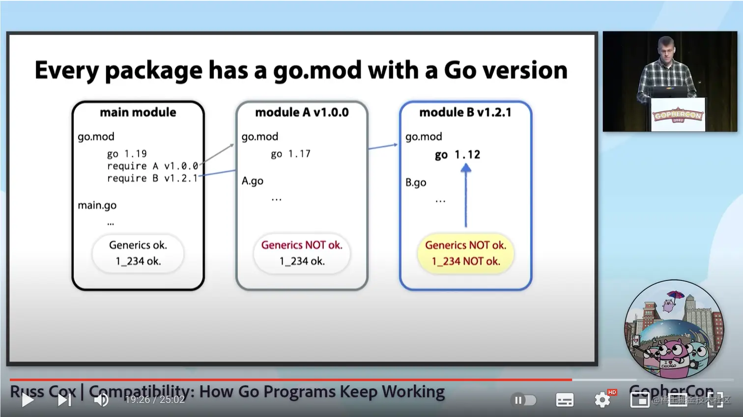 本周末在学习的时候,看到 Go 团队大当家 Russ Cox(下称:rsc)在近期分享的《GopherCon 2022: Russ Cox - Compatibility: How Go Programs Keep Working》,讲的是 Go 在兼容性方面的现有问题和思考,还埋了个新预期。