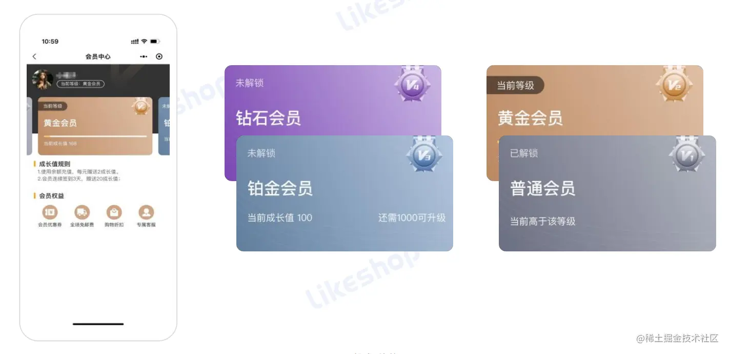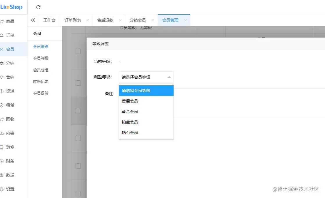 会员管理—等级调整:可以调整会员的等级,普通会员、黄金会员、铂金会员、钻石会员,如下图所示:
