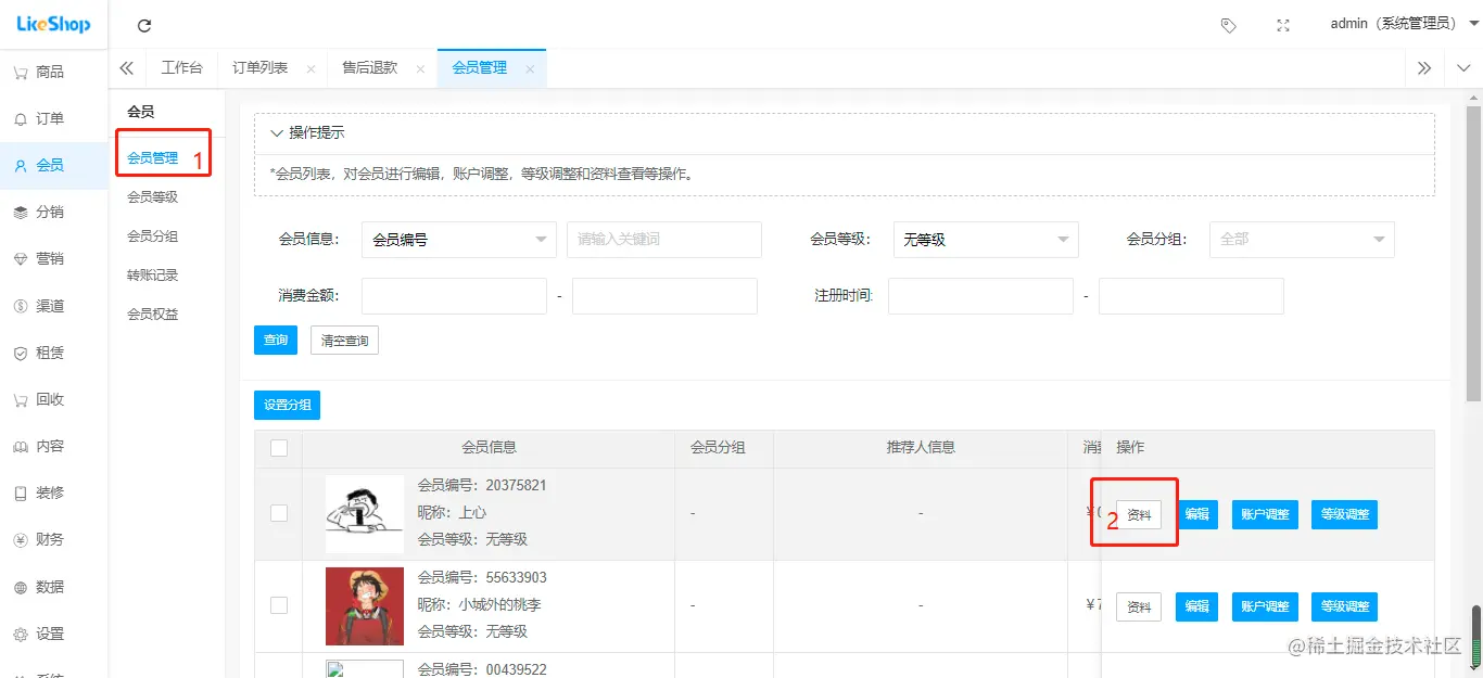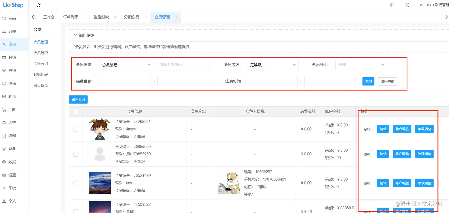 会员列表,对会员进行编辑、账户调整,等级调整,对会员进行分组和资料查看等操作,如下图所示: