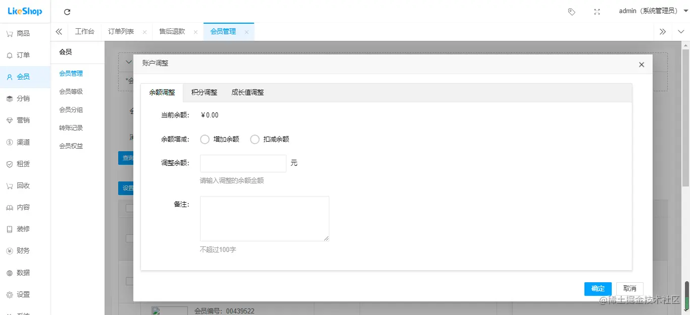 会员管理—账户调整:可对余额、积分、成长值进行调整,如下图所示: