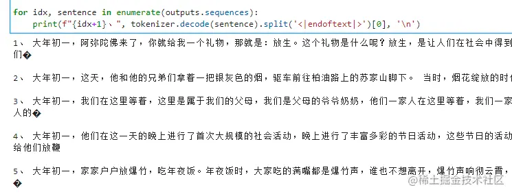 print(f"{idx+1}、", tokenizer.decode(sentence).split('<|endoftext|>')[0], '\n')