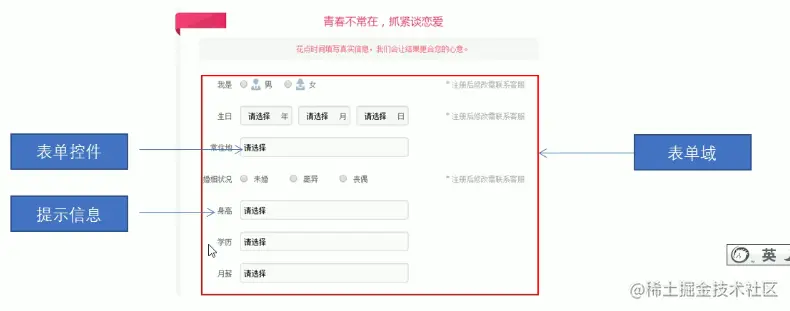 在表单域中可以定义各种表单元素,这些表单元素就是允许用户在表单中输入或者选择的内容控件