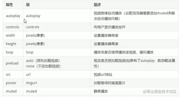视频标签是重点,我们经常设置自动播放,不是用controls控件,循环和设置大小属性