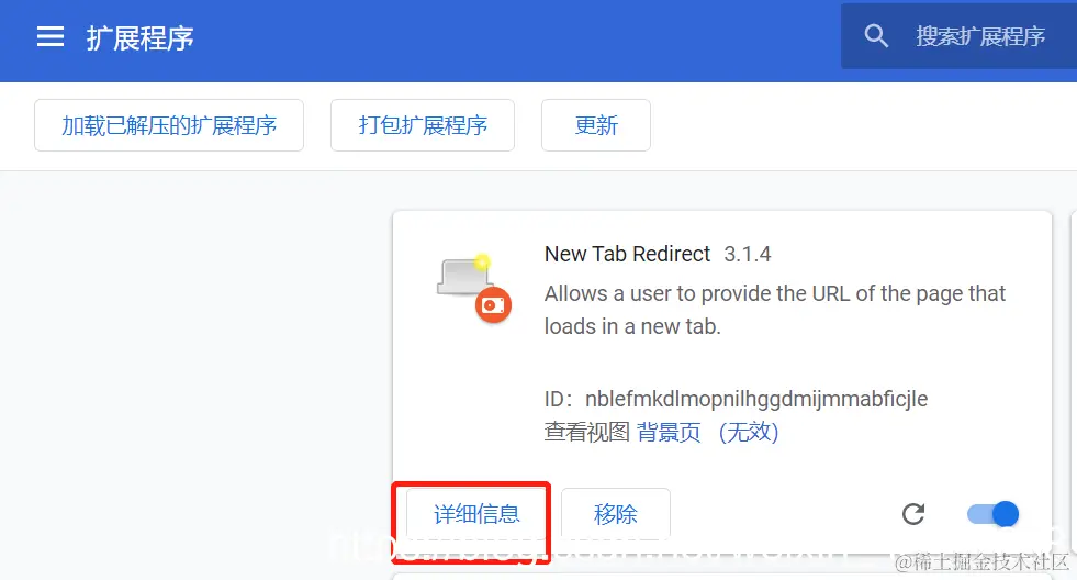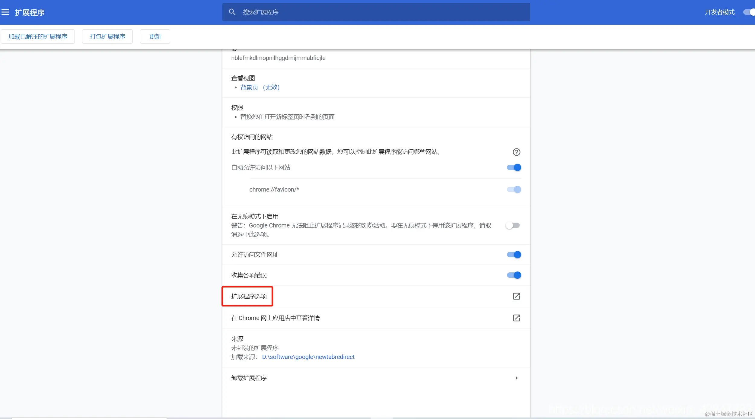 1)点击右上角扩展程序,选择New Tab Redirect后边的更多,也就是 竖着的三个点,点里边的选项也可以进入New Tab Redirect的设置