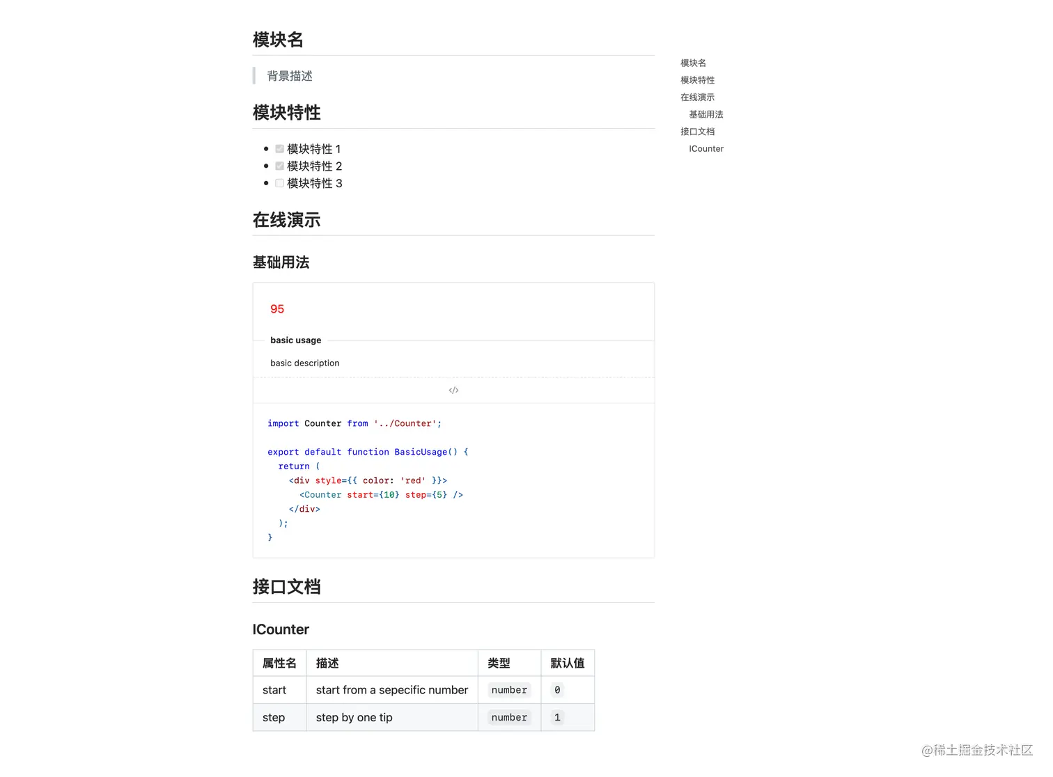 从构建角度看,React 应用程序由若干模块构成,导出 React 组件的模块不妨称之为 React 模块。对一些比较关注的 React 模块,开发同学或许想描述其背景、模块特性、在线演示、接口文档等,而其中在线演示对 React 模块来说非常直观有效,尤为重要。