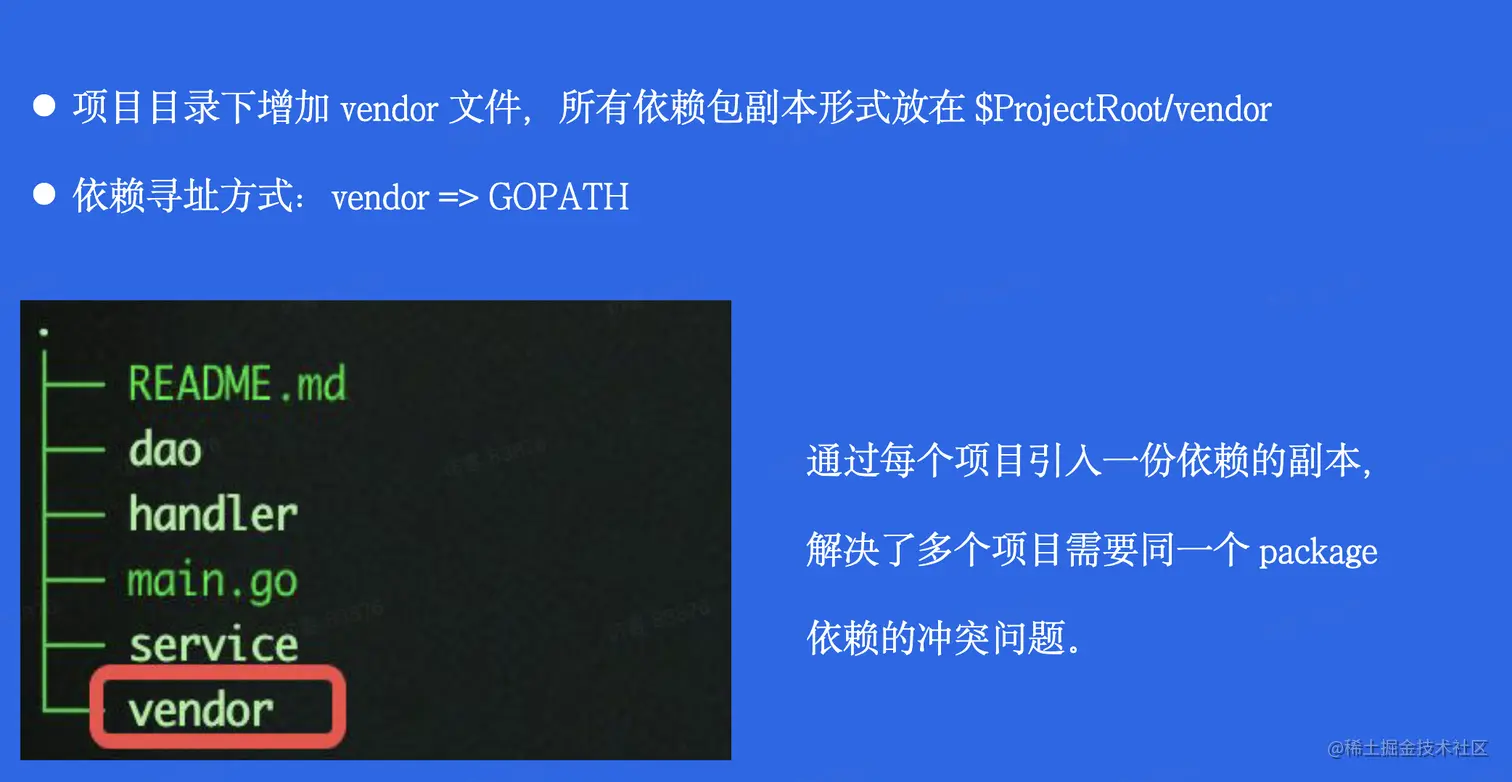 在GOPATH的基础上由多加了一层,需要几个版本的依赖就引入几个版本